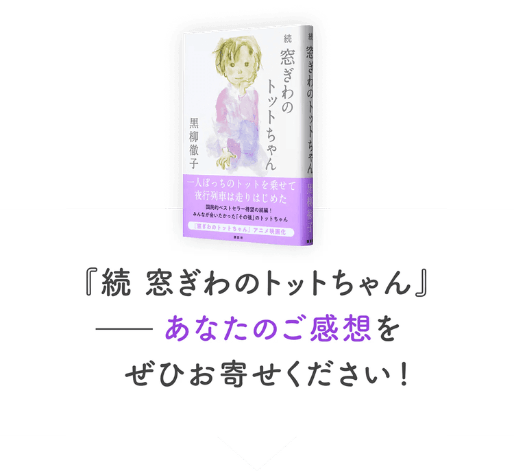 この度、『続 窓ぎわのトットちゃん』を書いて下さってありがとうございます。読み終えて温かい気持ちになりました。随分前のことを非常に細かく記憶されいることに驚きました。お母様やトットちゃんの逞しさや、当時の方々の生きることへの必死さや生きる力を感じました。